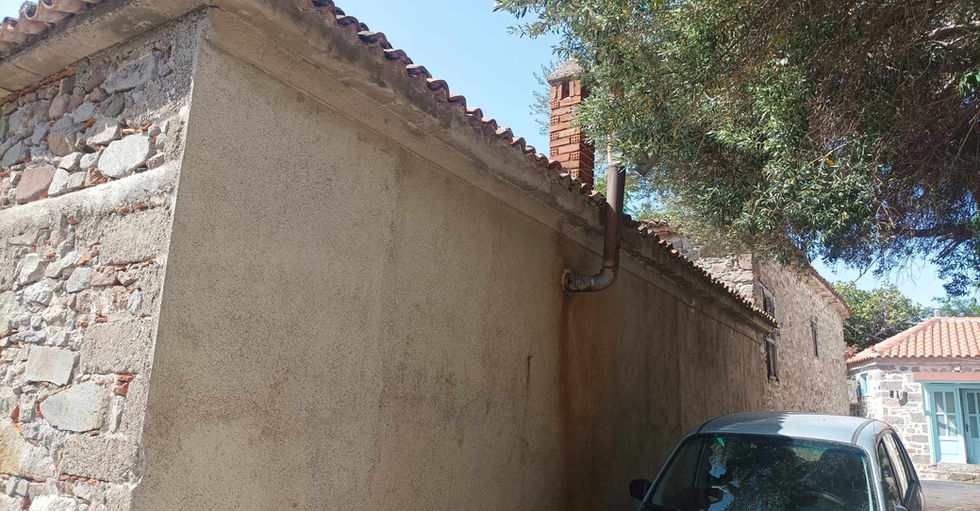 Two houses and few storage buildings in a big garden with trees near the center of eressos.