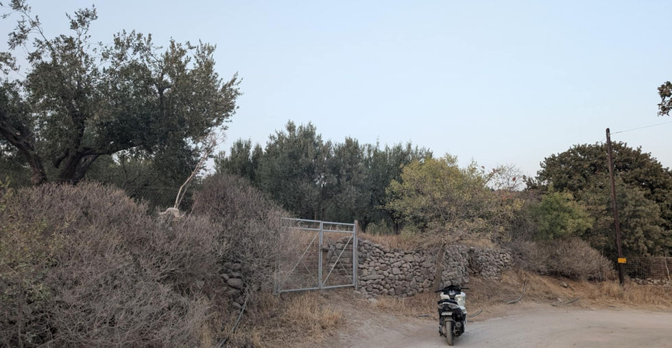 Olive tree-covered land across from Osho Afroz.